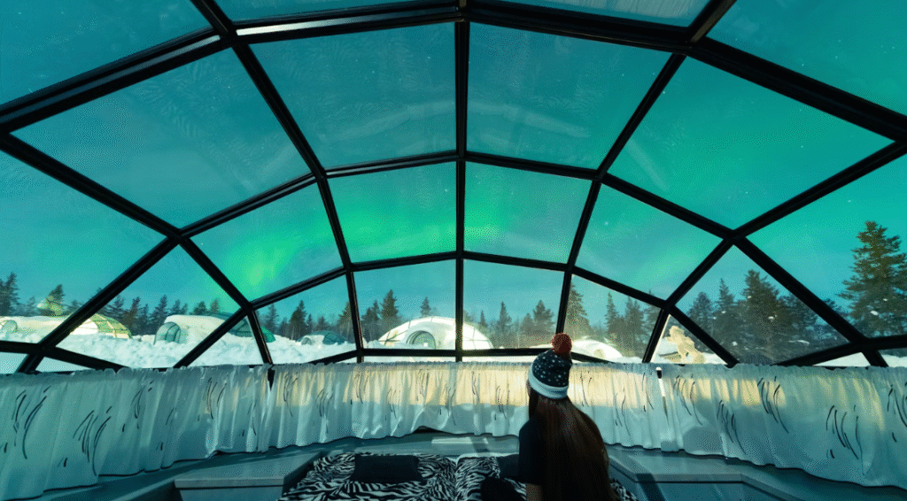 ✨ Stay in a cozy cabin or igloo and watch snowfall from your window.