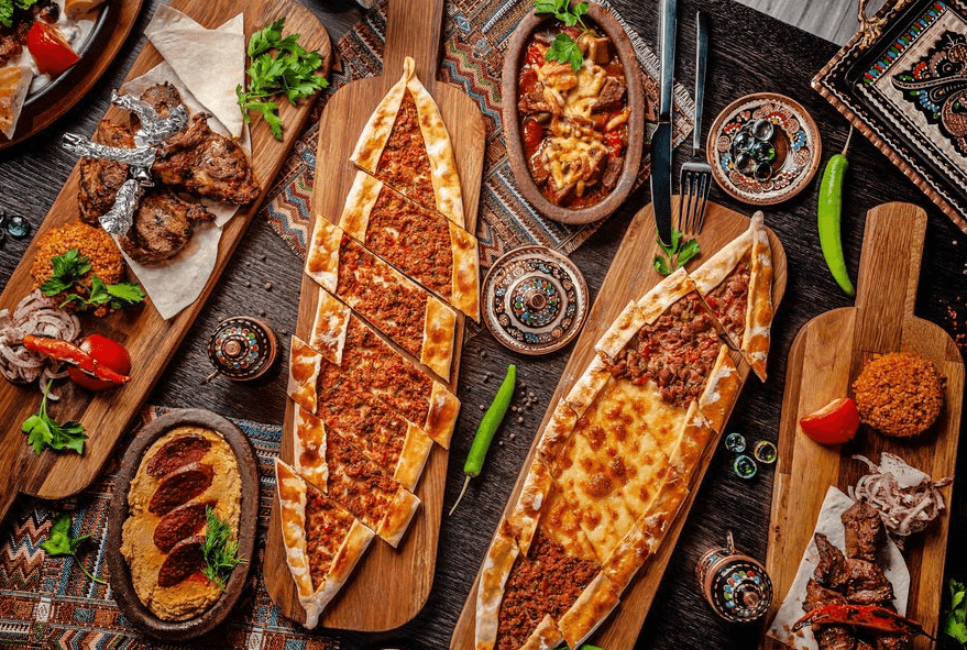Enjoy kebabs grilled to perfection, soft pide bread, rich lentil soups, and flavorful meze spreads. Turkish breakfasts are legendary, filled with olives, cheeses, eggs, honey, and fresh bread. And of course, baklava and Turkish delight satisfy every sweet craving.
