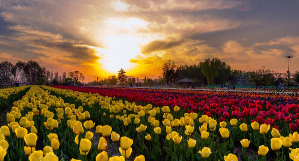 There are places that look beautiful… and then there’s Srinagar during tulip season — a moment when nature decides to pick up all her brightest colours and paint the city like a real-life canvas. If you’ve ever wondered what “heaven on earth” truly looks like, visit Kashmir in April when tulips wake up after winter and blanket the valley in thousands of vibrant shades.
